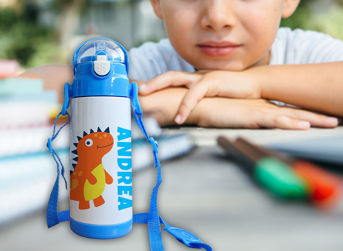 Borraccia personalizzata per bambini nei colori rosa e azzurro, tappo con beccuccio in silicone utile ad evitare le fuoriuscite della bevanda, comoda da portare con sé grazie alla tracolla in tela. Dimensioni comode anche per inserirla nello zainetto scolastico.