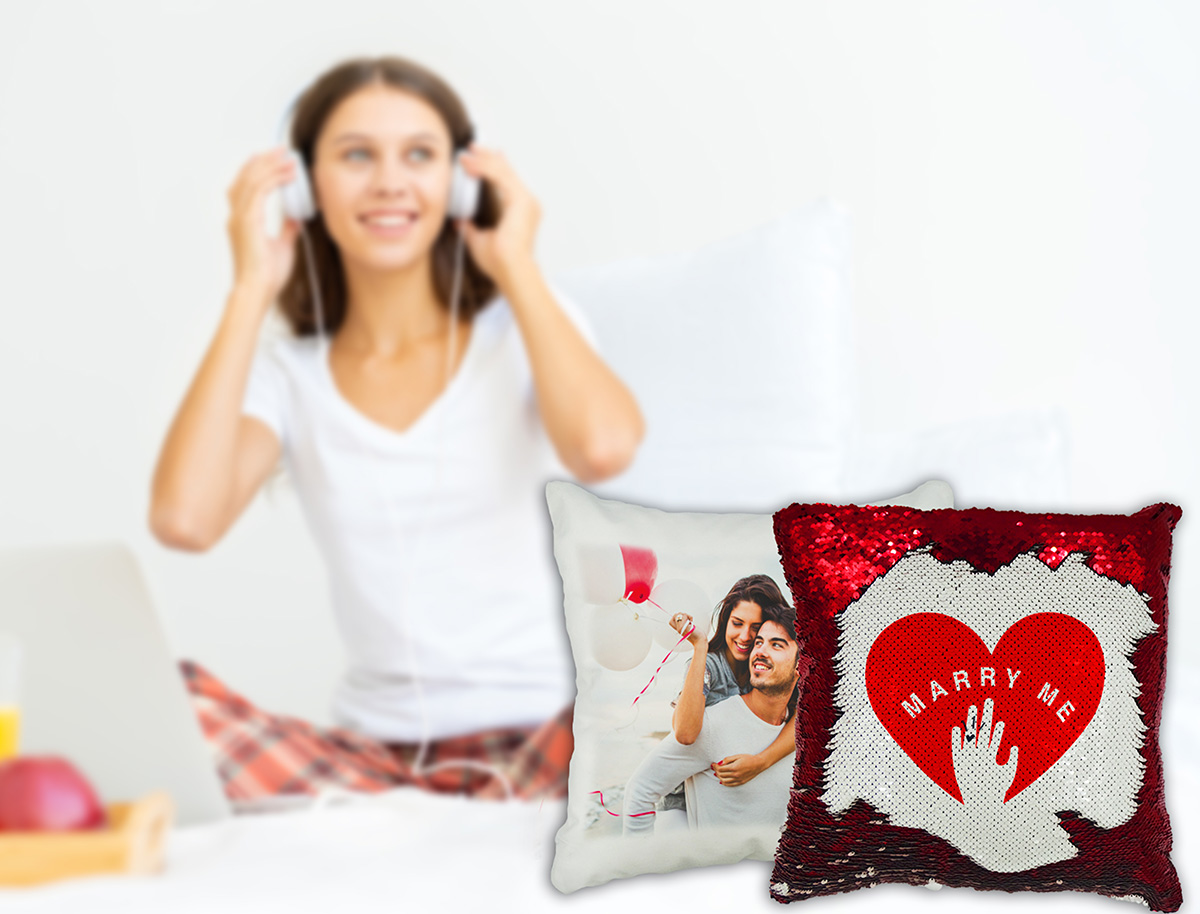 Federa per cuscino con lato anteriore ricoperto di paillettes bicolore. L’immagine viene stampata sul lato bianco delle paillettes, passandoci sopra con la mano e cambiando il verso delle paillettes il cuscino apparirà del colore scelto.
