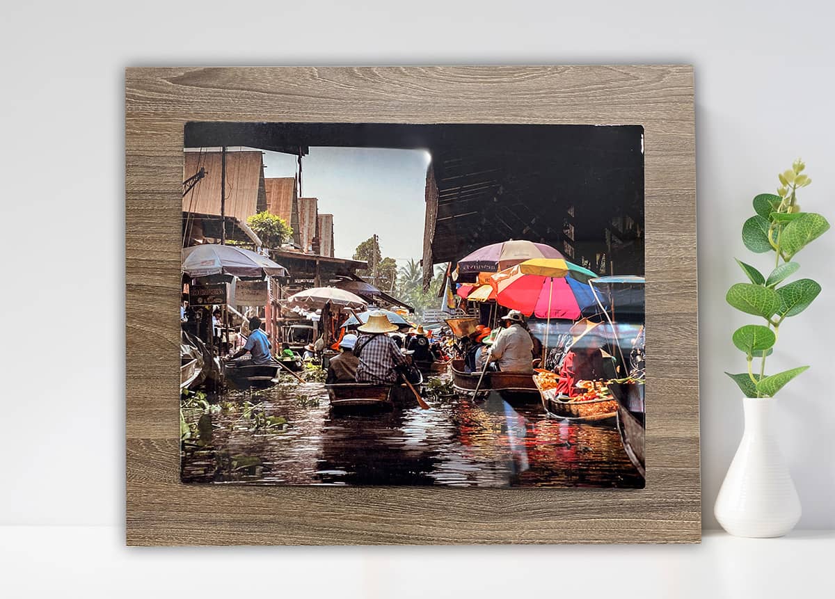Pannello di alluminio con stampa HD montato su supporto in legno venato, disponibile nei colori grigio, browny e urban. Cartteristica del prodotto è la brillantezza dei colori che sull’alluminio ha una resa particolarmente eccellente.