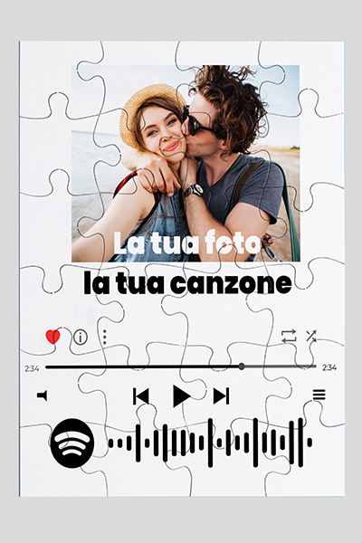 Puzzle con stampa fotografica HD, finitura lucida. Per la personalizzazione carica la tua immagine nell’area sottostante, inserisci la tua dedica (non obbligatoria) e poi il titolo o il link spotify del brano o della playlist che preferisci.
