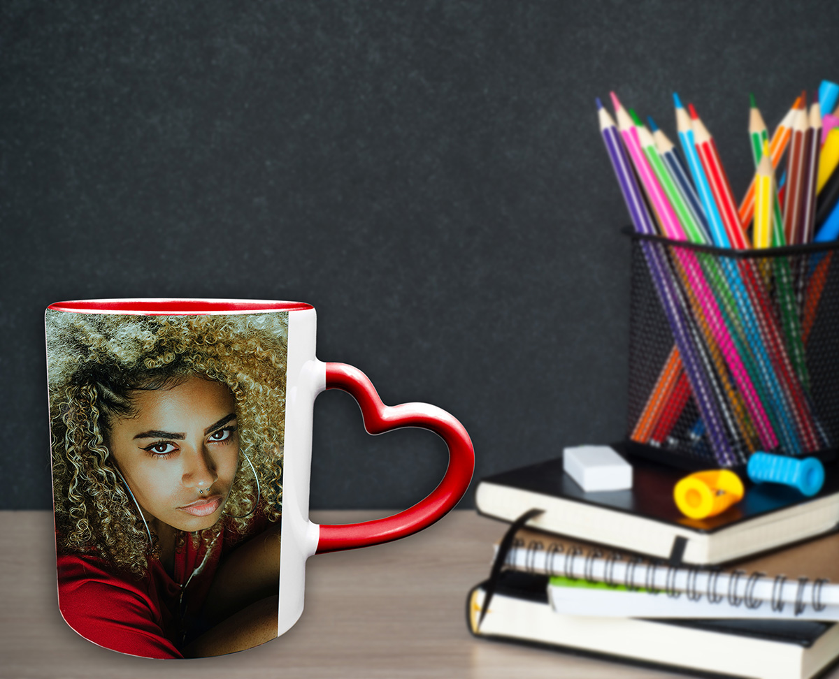 Tazza in ceramica bianca con manico a cuore e interno rosso. Lavabile in lavastoviglie ed adatta al forno a microonde. Superficie interamente stampabile.